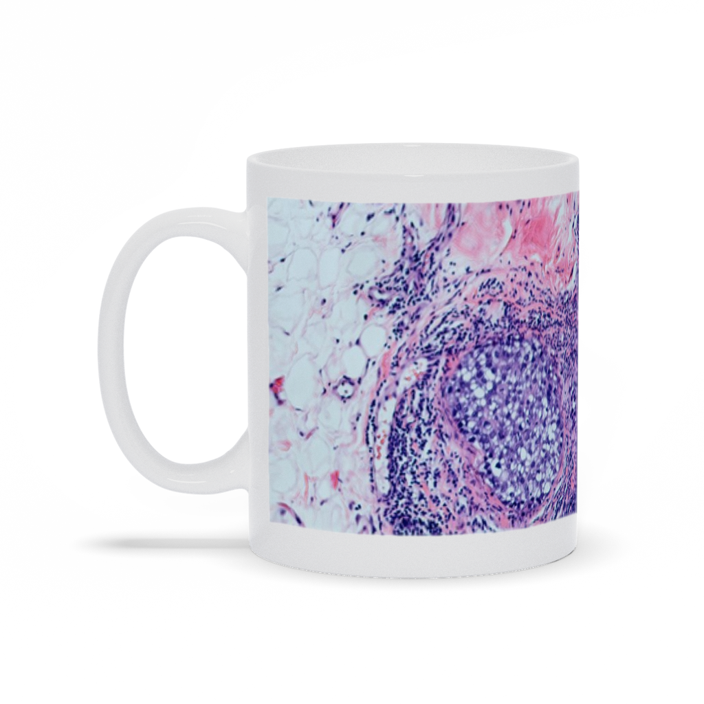 When Jamie and I met, we bonded instantly over discussing the science of BRCA1. My best friend's mom passed due to her BRCA gene, so it felt meaningful to focus on that. And when I discussed with our mentor my history of photographing biological tissue under a microscope, she had the great idea for Jamie to contact her hospital and request her biopsy slides! In the actual piece, I focused on the clearest example of what cancer does to your cells.