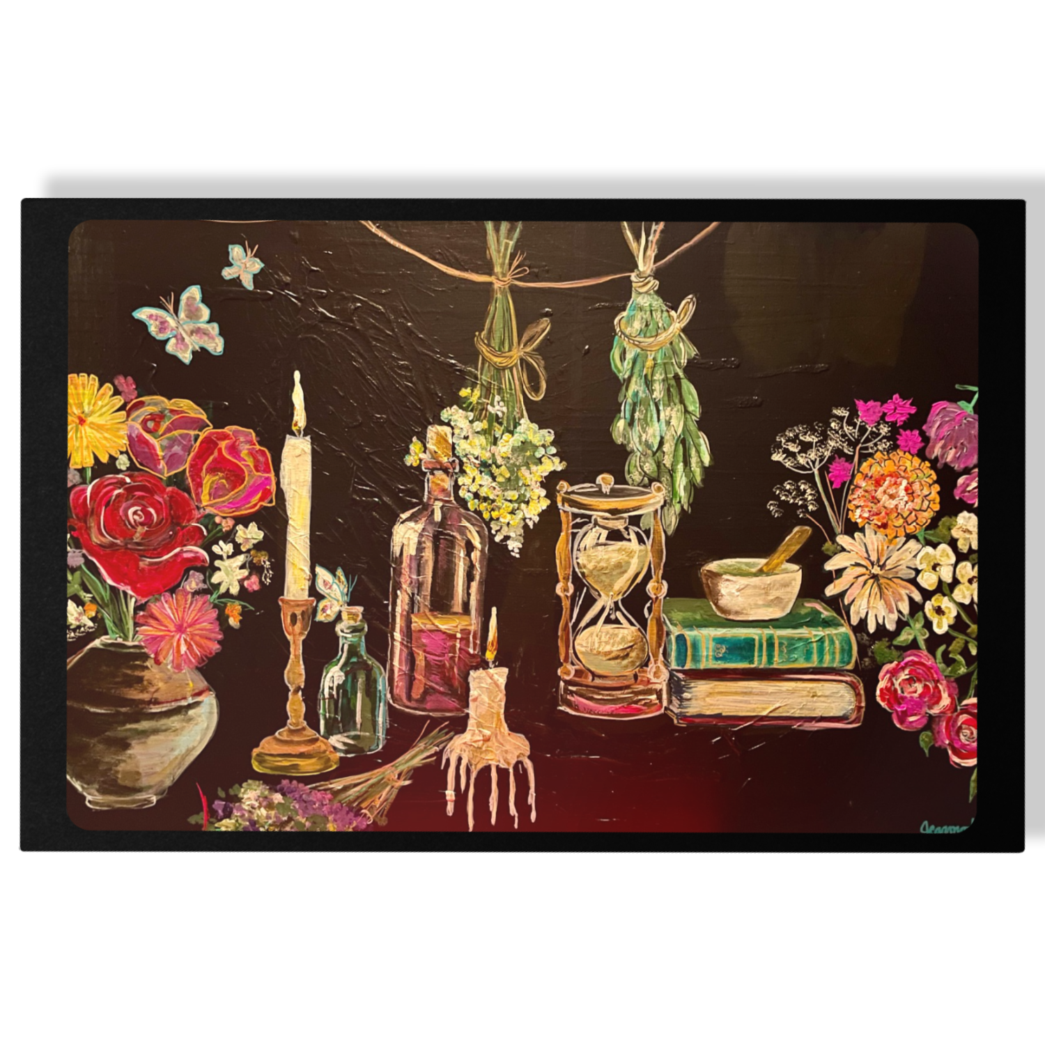 Jacqueline's Artist Statement: I visualized Sarah's story coming to life as I imagined myself exploring the apothecary of her mind and spirit. Sarah is not only a cancer survivor, she is a doula, artist, healer, mother, sister, wife, friend, and much more. The images depicted in the artwork are symbols and metaphors for life, death, growth, birth, tragedy, and love. I chose to keep a dark and textured background to leave a sense of mystery and unknown. This unknown is something Sarah is able to navigate with patience and grace. I hope to take the viewer on a journey as they observe the story of this beautiful woman.