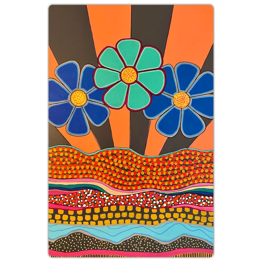 Kelly shared how the cancer experience can completely turn your life upside down, and then spit you back out as if nothing ever happened. How exactly should you return to "life" after cancer as a young adult? It feels as if time was personally frozen, but the rest of the world has gone on its way and is expecting you to keep up. I chose to reflect this experience through an abstract maximalist painting. The image represents going on a journey, hike, or adventure and then getting unexpectedly lost.