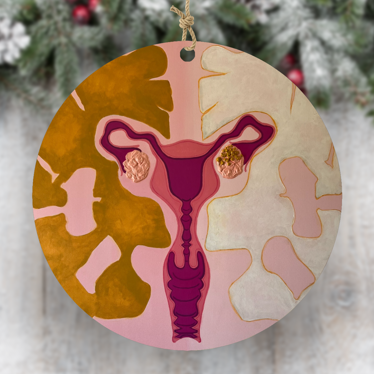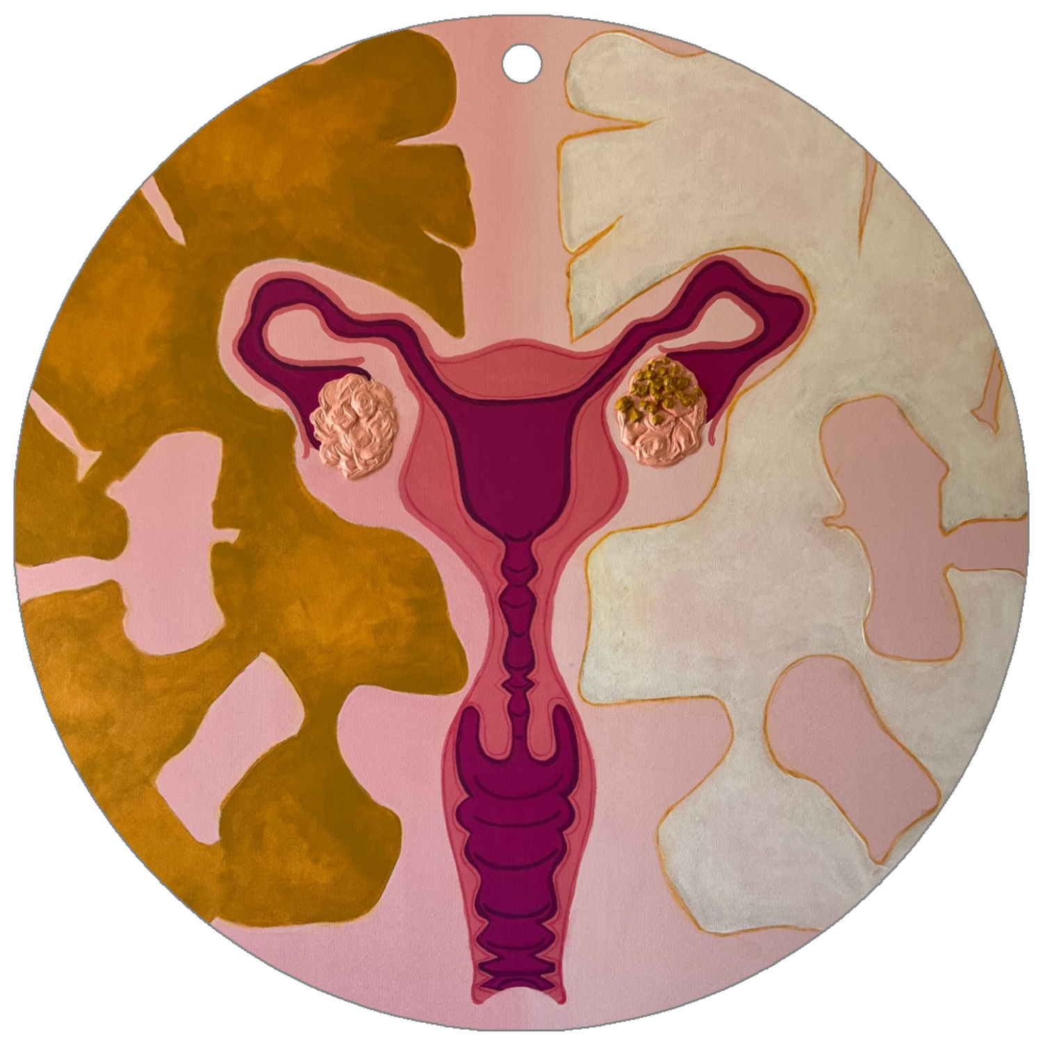 Kathryn's Artist Statement: My artwork depicts human disease, scars, and the body’s interior and microscopic matter. The images are abstractions created from source material of medical science. My exploration started in graduate school, while my family cared for a terminally ill child relative with cancer. Visually, the surprising colors of disease made a deep impression on me. Non-traditional color choices take my images from realism to abstraction and create a way for me to inject positivity into a somber subject matter. This year, I had the honor to work with my sister, Lynne, as my Inspiration, and it was an absolute privilege. Lynne is living with a tough dual diagnosis of ovarian cancer and early-onset dementia. Reflected in this work aren’t just for these past six months but a lifetime of communication and love. It has been very difficult to watch Lynne’s dementia whittle away her ability to communicate, especially when she needs it most. The painting I created depicts ovaries within a bisection of a brain with dementia. I chose graphic shapes and bright colors to create something like a visual medal and chalice to honor my sister’s grit, resolve and joy in the face of her complex challenges. The title, “Never Not Tender,” not only speaks to Lynne’s physical experience but also describes our relationship to each other in this process and always.